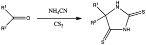 Une variation de la réaction de Bucherer-Bergs est le traitement du composé carbonylé par le disulfure de carbone et le cynaure d'ammonium dans le méthanol afin de former un équivalent soufré de l'hydantoïne, la 2,4-dithiohydantoïne[7] :