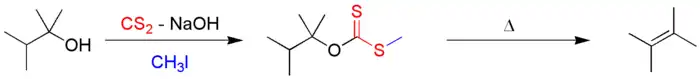 À une température d'environ 200 °C, l'alcène est ensuite formé par élimination interne : au sein d'un état de transition hexacyclique, l'atome d'oxygène du xanthate arrache l'hydrogène du carbone β dans un processus d'élimination syn. Le produit secondaire ainsi obtenu se décompose en oxysulfure de carbone (OCS) et en méthanethiol.