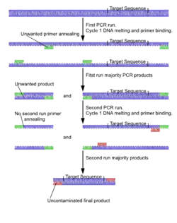 Ainsi, la PCR nichée permet, par l'implication de deux paires d'amorces utilisées successivement de limiter ce phénomène, la seconde paire d'amorces étant censée amplifier une séquence se trouvant au sein du produit de la première PCR.
