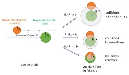 L’interaction entre les noyaux commence à être effective lorsque le paramètre d’impact devient comparable à la somme des rayons des noyaux en interaction (voir figure), c’est-à-dire de l’ordre de quelques fermis (femtomètre) ou de la dizaine selon les noyaux considérés (voir article barrière coulombienne). Plus le paramètre d’impact, diminue plus la réaction devient violente, on passe des collisions périphériques, aux collisions intermédiaires et aux collisions centrales.