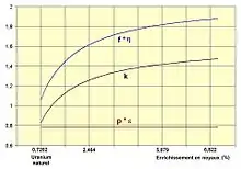 • Mis à part l'enrichissement, tous les termes de la relation donnant η sont des constantes physiques. Les grandeurs interviennent en termes relatifs via des rapports et non point en valeur absolue ce qui confère une robustesse très relative au résultat vis-à-vis des variations de températures, spectre en énergie des neutrons et autres. Les valeurs trouvées pour η sont indépendantes de la concentration en matière fissile du milieu considéré ; elles ne dépendent que des concentrations relatives des corps présents dans le milieu exprimées par l'enrichissement en uranium 235.