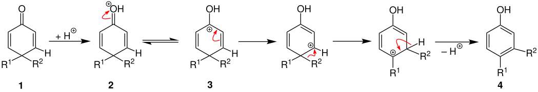 La 2,5-cyclohexadién-1-one 4,4-disubstituée (1) est protonée pour donner un ion oxonium réactif (2). La charge positive se propage ensuite à l'atome de carbone en position 1 (3) jusqu'à l'atome en position 4, induisant le réarrangement de l'un des deux subsituants, la molécule étant finalement stabilisée par déprotonation (4).