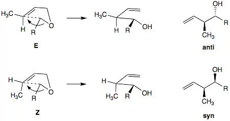 Les réarrangements sigmatropiques 2,3 peuvent offrir une haute stéréosélectivité. Lors de la formation de la nouvelle liaison double, il y a une forte préférence a former l'alcène E ou isomère trans. La stéréochimie de la nouvelle liaison C-C est quant à elle difficile à prédire. Elle peut être déduite du cycle à cinq de l'état de transition. Généralement, l'alcène E favorisera la formation du produit anti, alors que l'alcène Z favorisera celle du produit syn.
