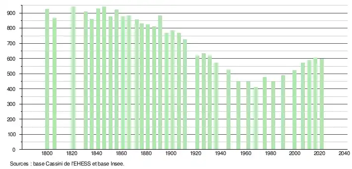 L'évolution du nombre d'habitants est connue à travers les recensements de la population effectués dans la commune depuis 1800. Pour les communes de moins de 10 000 habitants, une enquête de recensement portant sur toute la population est réalisée tous les cinq ans, les populations légales des années intermédiaires étant quant à elles estimées par interpolation ou extrapolation[27]. Pour la commune, le premier recensement exhaustif entrant dans le cadre du nouveau dispositif a été réalisé en 2006[28].