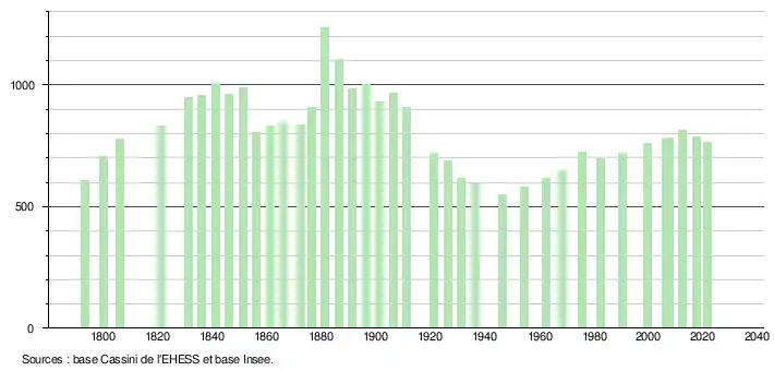 L'évolution du nombre d'habitants est connue à travers les recensements de la population effectués dans la commune depuis 1793. Pour les communes de moins de 10 000 habitants, une enquête de recensement portant sur toute la population est réalisée tous les cinq ans, les populations légales des années intermédiaires étant quant à elles estimées par interpolation ou extrapolation[20]. Pour la commune, le premier recensement exhaustif entrant dans le cadre du nouveau dispositif a été réalisé en 2007[21].