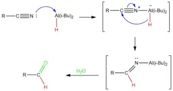 Un hydrure courrament utilisé pour convertir les nitriles en aldéhydes est l'hydrure de diisobutylaluminium ou DIBAL-H[14]. Le mécanisme proposé pour expliquer la réaction implique que le DIBAL forme un adduit acide-base de Lewis avec le nitrile via la formation d'une liaison N-Al ; l'hydrure est ensuite transféré de l'aluminium au nitrile, et le sel d'iminium est ensuite hydrolysé pour obtenir l'aldéhyde désiré[15].