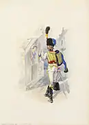 Pelisse, parements et retroussis du dolman blancs, dolman, surtout et pantalon bleu céleste, gilet rouge, tresses et boutons jaunes, manteau vert, schakos doublés en bleu[1].