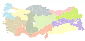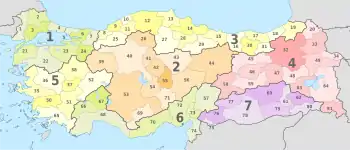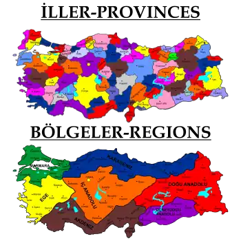 Les provinces de Turquie (iller), au nombre de 81, sont généralement regroupées sur les 7 régions géographiques traditionnelles (coğrafi bölgeler) qui les recouvrent principalement.