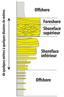 Log stratigraphique d'une régression marine : diminution progressive de la profondeur (passage de l'offshore, au shoreface, au foreshore) puis nouvelle transgression et retour à un environnement offshore.