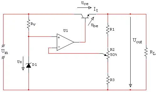 Sur la figure ci-dessus, l'asservissement de la tension de sortie se fait grâce à l'amplificateur opérationnel (AO) U1 ainsi qu'au pont diviseur de tension constitué de R1, R2 et R3. Le pont diviseur de tension fournit une image de la tension de sortie Uout à l'AO U1 qui augmente sa tension de sortie si la tension de référence est en dessous de l'image de la tension de sortie et vice-versa en cas de tension négative.