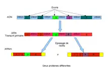 Au cours de l’épissage, les introns sont retirés de la séquence de bases et les exons sont assemblés. Plusieurs molécules d’ARNm différentes peuvent être produites à partir d’un seul et même transcrit primaire : des exons peuvent être supprimés au même titre que des introns. Ce sont des protéines régulatrices, spécifiques à chaque type de cellule, qui déterminent quels sont les exons à conserver en se liant aux séquences régulatrices du transcrit primaire. Ce processus permet d’augmenter le nombre de protéines qu'il est possible de synthétiser.