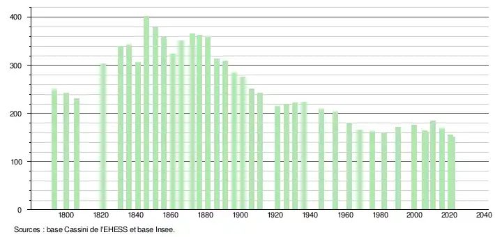 | L'évolution du nombre d'habitants est connue à travers les recensements de la population effectués dans la commune depuis 1793. Pour les communes de moins de 10 000 habitants, une enquête de recensement portant sur toute la population est réalisée tous les cinq ans, les populations légales des années intermédiaires étant quant à elles estimées par interpolation ou extrapolation[17]. Pour la commune, le premier recensement exhaustif entrant dans le cadre du nouveau dispositif a été réalisé en 2005[18]. En 2021, la commune comptait 152 habitants[Note 4], en diminution de 9,52 % par rapport à 2015 (Hautes-Pyrénées : +1,04 %, France hors Mayotte : +1,84 %). |