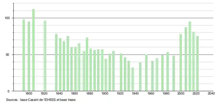 L'évolution du nombre d'habitants est connue à travers les recensements de la population effectués dans la commune depuis 1793. Pour les communes de moins de 10 000 habitants, une enquête de recensement portant sur toute la population est réalisée tous les cinq ans, les populations légales des années intermédiaires étant quant à elles estimées par interpolation ou extrapolation[29]. Pour la commune, le premier recensement exhaustif entrant dans le cadre du nouveau dispositif a été réalisé en 2006[30].