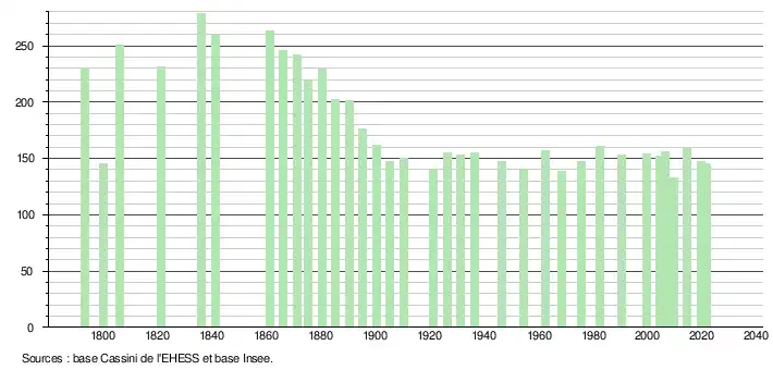 L'évolution du nombre d'habitants est connue à travers les recensements de la population effectués dans la commune depuis 1793. Pour les communes de moins de 10 000 habitants, une enquête de recensement portant sur toute la population est réalisée tous les cinq ans, les populations légales des années intermédiaires étant quant à elles estimées par interpolation ou extrapolation[15]. Pour la commune, le premier recensement exhaustif entrant dans le cadre du nouveau dispositif a été réalisé en 2004[16].