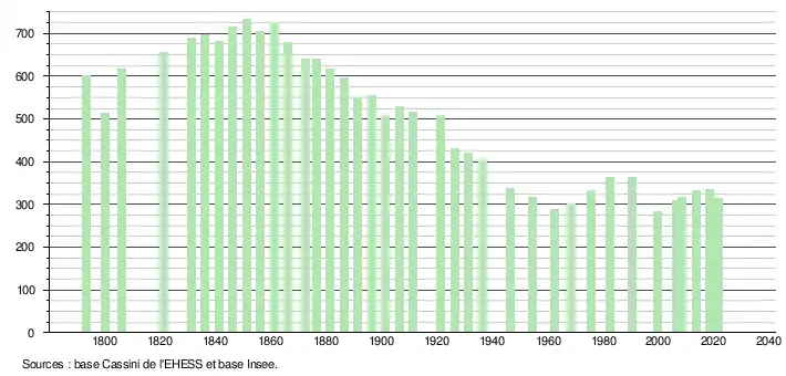 L'évolution du nombre d'habitants est connue à travers les recensements de la population effectués dans la commune depuis 1793. Pour les communes de moins de 10 000 habitants, une enquête de recensement portant sur toute la population est réalisée tous les cinq ans, les populations légales des années intermédiaires étant quant à elles estimées par interpolation ou extrapolation[33]. Pour la commune, le premier recensement exhaustif entrant dans le cadre du nouveau dispositif a été réalisé en 2008[34].