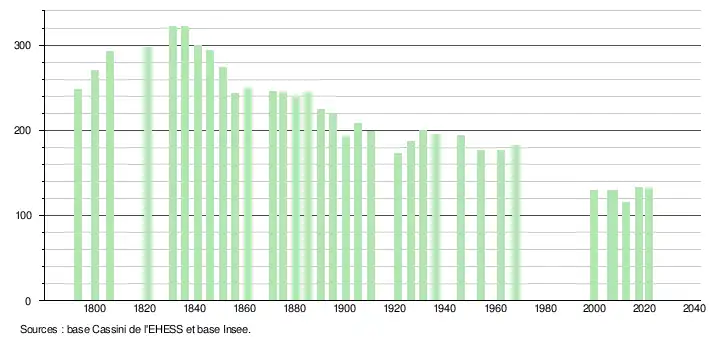 L'évolution du nombre d'habitants est connue à travers les recensements de la population effectués dans la commune depuis 1793. Pour les communes de moins de 10 000 habitants, une enquête de recensement portant sur toute la population est réalisée tous les cinq ans, les populations légales des années intermédiaires étant quant à elles estimées par interpolation ou extrapolation[17]. Pour la commune, le premier recensement exhaustif entrant dans le cadre du nouveau dispositif a été réalisé en 2007[18].