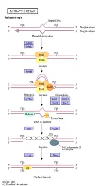 Le Mismatch repair est un mécanisme de surveillance de l'ADN lors de la réplication qui permet de réparer préférentiellement ces erreurs dans le brin nouvellement synthétisé. La reconnaissance du brin matrice par rapport au brin nouvellement synthétisé est basée sur la présence de méthylations spécifiques dans le premier, ce qui permet à la cellule de reconnaître la copie de l'original et d'éviter de modifier ce dernier. Il implique plusieurs protéines très conservées, connues sous le nom de Mut chez les bactéries, qui tirent leur nom du fait que leur dysfonctionnement engendre l'apparition de nombreuses mutations dans les souches bactériennes. Chez l'humain, l'altération des gènes correspondants est responsable de l'apparition de cancers précoces avec une forte prévalence.