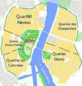 Novgorod se développe vers 950. Sur la rive gauche du Volkhov se trouvent la citadelle ou Kremlin de Novgorod (Detinets), le quartier du Commun au sud-ouest, et le quartier de Nerevo au nord-ouest, une friche existe entre les deux quartiers qui est devenue plus tard le quartier d'Outre-Château. Sur la rive droite se développe le quartier Slavno au sud-est. Dans la partie nord-est va se développer le quartier des Charpentiers. Les deux rives sont réunies par le grand pont (Most Veliki) sur le Volkhov[5].
