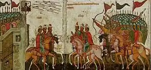 L'invasion mongole de la Rus' de Kiev de la Horde d'or commence en 1237. Batu, petit-fils de Gengis Khan, enlève Riazan, Vladimir, Souzdal, entre décembre 1237 et février 1238, pillant et massacrant le pays. Le , sur la Sit, les Mongols remportent une victoire et le grand-prince de Vladimir, Iouri II de Vladimir est tué. La Chronique de Vladimir Souzdal indique qu'il avait quitté Vladimir pour se joindre aux troupes de son frère Iaroslav, grand-prince de Kiev. Torjok tombe le sans avoir reçu de secours et les Mongols prennent alors la direction de Novgorod mais ils font demi-tour quand ils arrivent près du lac d'Ilmen, au lieu-dit la Croix d'Ignace. Les Mongols attaquent en 1240 les villes sur la rive gauche du Dniepr. Pereïaslav tombe le , Tchernihiv le . Finalement Kiev, sur la rive droite, est prise le [19]. C'est dans ce contexte qu'Alexandre Nevski, prince de Novgorod en 1236-1240, puis 1242-1246, combat au nord contre les Suédois et l'Ordre de Livonie. En 1241, le Grand-khan Ögedeï meurt et Batou revient s'installer dans la Basse-Volga, à Saraï Batu. Iaroslav II de Vladimir, père d'Alexandre Nevski, est choisi comme grand-prince de Vladimir par Batu mais il est tué le à Karakorum victime de rivalités entre Güyük et Batu. Alexandre Nevski et ses frères Iaroslav III de Vladimir et André II de Vladimir se rendent à la Horde où Batu nomme Alexandre Nevski grand-prince de Kiev et André grand-prince de Vladimir. EN 1253, Alexandre Nevski se rend auprès de la Horde pour dénoncer les intrigues de ses frères. Il est alors nommé grand-prince de Vladimir par Batu. Batu meurt vers 1255. Il est remplacé par Berké Khan. Les Mongols imposent à Alexandre Nevski de faire le recensement de l'ensemble des terres russes pour prélever leur tribut. Ils imposent aussi des taxes commerciales. Les Novgorodiens s'y opposent. En 1259, Alexandre Nevski doit accompagner lui-même les recenseurs pour les forcer à obéissance. Après avoir installé son fils Dimiti comme prince de Novgorod en 1262, il doit aller en 1263 après de Berké Khan qui ne lui permet de revenir à Vladimir qu'à l'automne 1263 mais, en mauvaise santé, il meurt pendant le voyage à Gorodets, le . Novgorod va suivre une politique de balancier entre les fils d'Alexandre Nevski, Dimitri et André, ce dernier faisant appel à la Horde d'or contre son frère, puis entre les maisons de Tver et de Moscou avec l'arbitrage des khans de la Horde d'or[20].