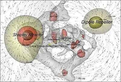 L'attracteur Shapley, une autre zone à l'opposé du point de vue de la Voie lactée, crée une force attractive sur le mouvement des galaxies. Cette attraction localisée, complétée par la position du répulseur du dipôle, sont les principaux contributeurs de l'anisotropie dipolaire du fond diffus cosmologique.