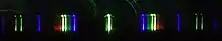 Raies spectrales du mercure observées à travers un réseau de diffraction dans un goniomètre.