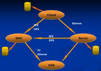 Dans le cas du NAS, la ressource de stockage est directement connectée au réseau IP de l'entreprise. Le serveur NAS intègre le support de multiples systèmes de fichiers réseau, tels que Common Internet File System (CIFS) protocole de partage de Microsoft et de Samba, Network File System (NFS) qui est un protocole de partage de fichiers Unix, ou encore AFP (AppleShare File Protocol) qui est l'équivalent pour la technologie Apple. Une fois connecté au réseau, il peut jouer le rôle de plusieurs serveurs de fichiers partagés.