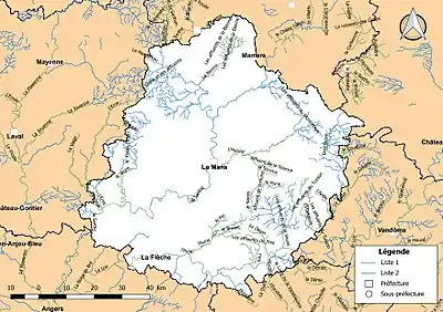 Le département de la Sarthe est entièrement situé dans le bassin hydrographique de la Loire, à savoir le bassin Loire-Bretagne. D'une longueur de 4 500 km[3], le réseau hydrographique départemental comprend 11 cours d'eau de longueur supérieure à 50 km et 61 de longueur supérieure à 10 km.