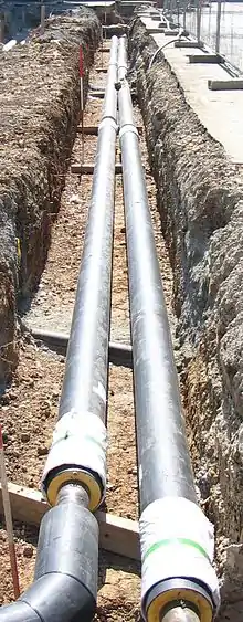 Les canalisations transportent et distribuent la chaleur par un fluide caloporteur (eau chaude ou vapeur)[9]. Il s'agit de conduites le plus souvent en polyéthylène réticulé ou en acier entouré d'une couche d'isolant (mousse en polyéthylène réticulé ou en polyuréthane), elle-même revêtue d'une gaine en polyéthylène haute densité (annelée ou non). Il existe également des conduites en plastique, moins isolées mais d'installation plus aisée grâce à leur flexibilité et à l'absence de soudures à réaliser sur les chantiers.