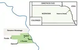 En 1865, les Omahas doivent se séparer de presque 162 km2 pour accueillir la tribu Winnebago au nord de la réserve[6].