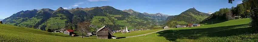 Panorama de l'ensemble de la Großes Walsertal avec tous ses villages, pris sur la hauteur de Raggal, à 1071 m, de gauche à droite : Thüringerberg, Sankt Gerold, Blons, Raggal, Sonntag et Fontanella .