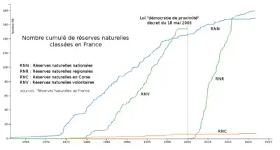 La loi relative à la démocratie de proximité du 27 février 2002[1] a modifié le Code de l'environnement en instituant trois nouveaux types de réserves naturelles en France :