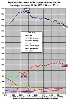 Au 31 mars 2011, le dollar américain représentait 60,7 % des réserves de change en devises allouées dans le monde contre 61,5 % trois mois plus tôt. L'euro constituait 26,6 % des réserves allouées contre 26,1 % trois mois plus tôt. Fin mars 2011 la part du dollar dans les réserves allouées en devises des États était au plus bas depuis fin 1996.