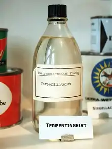 - Essence de térébenthine — liquide incolore ou jaune pâle, d'odeur forte et pénétrante; altérable à l'air et à la lumière; un peu visqueux[25]; siccatif[26]; obtenu par distillation de la térébenthine du pin. Il est composé de terpènes, principalement les monoterpènes alpha-Pinène et β-Pinène. On trouve, dans l'essence de térébenthine fraîche de Pinus palustris, 80 à 83% d'alpha-Pinène, les caractères physiques et chimiques de l'essence sont donc principalement celle du pinène[2].