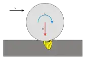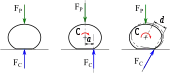 Soit un cylindre aplati sous l'effet d'un effort presseur et soumis à un effort moteur (force parallèle au plan, en rouge sur l'image ci-contre). Faire tourner le cylindre revient à le renverser ; il faut donc fournir une force suffisante, comme pour faire tomber un objet. D'un point de vue global, il faut que le point d'application de la force de contact plan/cylindre FC soit au bord du plat ; d'un point de vue microscopique, l'action de contact est une force répartie (pression), et il faut la concentrer du côté du bord. En effet, au moment du basculement, le reste de la surface de contact « décolle », le sol n'exerce pas d'action sur cette partie.
