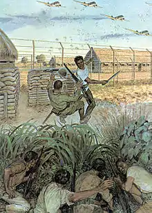 Il faut aussi compter avec les Juramentado, des rebelles qui ont lutté contre toutes les forces étrangères à Mindanao, qu’elles soient espagnoles, américaines ou philippines. Ils mettent leur expérience en matière de guérilla au service de la résistance, tant par des escarmouches que par des attaques-suicides[37]. Les Japonais répliquent en assassinant des civils et en détruisant leurs biens[38].