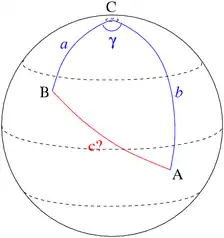 On considère deux points du globe A et B de latitudes respectives λA et λB, et de longitudes LA et LB. Pour déterminer leur distance on considère le triangle ABC, où C est le pôle nord. Dans ce triangle sont connus :