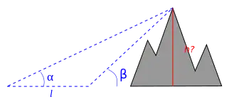 Une autre possibilité est la mesure de la hauteur h d'une colline ou d'une montagne depuis une vallée en mesurant sa hauteur angulaire α et β en deux points de distance connue l. La figure 2 ci-contre donne un cas simplifié dans lequel les points de mesure et la projection du sommet sur le sol sont alignés. La hauteur de la montagne peut être déterminée graphiquement ou bien analytiquement par résolution du triangle (même cas que précédemment) :