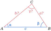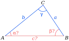 On considère un triangle dont un angle β est connu, ainsi qu'un côté adjacent de cet angle c et le côté opposé b. Le deuxième angle γ s'obtient par la loi des sinus, le dernier angle α par complément à π et le dernier côté par la loi des sinus :