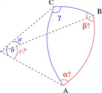 Dans le cas où les trois angles sont connus, les côtés s'obtiennent par une variante du théorème d'Al-Kashi pour les angles. Les formules donnant les côtés sont semblables à celles du cas de résolution complémentaire (les trois côtés connus) :