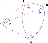 On considère un triangle dont l'angle γ est connu, ainsi que les deux côtés adjacents a et b. Le dernier côté s'obtient grâce au théorème d'Al-Kashi, les deux angles manquants par la loi des tangentes et le complément à π, et l'aire par la formule du produit vectoriel :