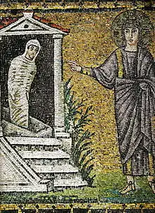 Selon Jean 11: 1-44[2], Jésus reçoit un message des deux sœurs de Lazare, malade, qui réclament son aide. Jésus dit à ses disciples : « Cette maladie n'est point à la mort, mais pour la gloire de Dieu, afin que le Fils de Dieu soit glorifié par elle. »