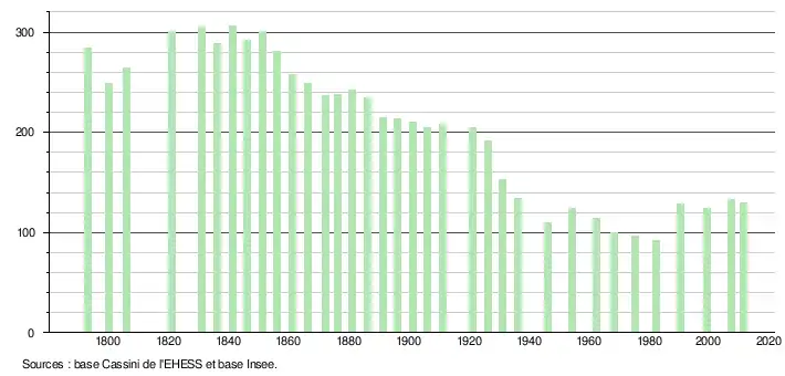 - Dans le tableau des recensements et le graphique, par convention dans Wikipédia, le principe a été retenu, pour les populations légales postérieures à 1999 de n’afficher dans le tableau des recensements et le graphique que les populations correspondant à l'année 2006, première population légale publiée calculée conformément aux concepts définis dans le décret no 2003-485 du 5 juin 2003, et les années correspondant à une enquête exhaustive de recensement pour les communes de moins de 10 000 habitants, ainsi que la dernière population légale publiée par l’Insee.