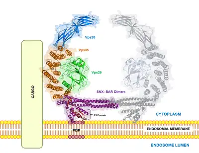 Le rétromère est un complexe hétéropentamérique qui, chez l'homme, est composé d'un dimère moins défini de nexine de tri associé à la membrane (contenant les protéines SNX1, SNX2, SNX5, SNX6) et d'un trimère de tri des protéines vacuolaire (Vps) contenant Vps26, Vps29, Vps35. Bien que le dimère SNX soit requis pour le recrutement du rétromère dans la membrane endosomale, la fonction de liaison du chargement de ce complexe est apportée via le trimère central par la liaison de la sous-unité Vps35 à diverses molécules du chargement[4] dont M6PR[5], wntless[6] et la sortiline[7]. Une des premières études sur le tri des hydrolases acides telles que la carboxypeptidase Y (CPY) chez les mutants de la levure S. cerevisiae a conduit à l'identification de rétromères dans la médiation du trafic rétrograde du récepteur pro-CPY (Vps10) des endosomes vers le TGN[8].