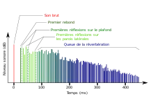 Lorsqu'on examine la réponse d'une salle à une impulsion, obtenue soit par un enregistrement direct, soit par l'analyse, on se rend compte que la réverbération se décompose en plusieurs phases. Après l'arrivée du son direct, des ondes qui ont rebondi une fois ou deux sur les parois arrivent après avoir parcouru un peu plus de chemin. En 1949, Helmut Haas a montré que ces réflexions, quand elles arrivent de 1 à 30 ms après le son direct, ne perturbent pas la perception de la direction d'origine du son, mais augmentent le volume sonore perçu[14]. Les réflexions latérales améliorent la dimension spatiale perçue de la source[15].
