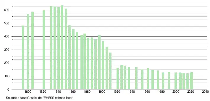 L'évolution du nombre d'habitants est connue à travers les recensements de la population effectués dans la commune depuis 1793. Pour les communes de moins de 10 000 habitants, une enquête de recensement portant sur toute la population est réalisée tous les cinq ans, les populations légales des années intermédiaires étant quant à elles estimées par interpolation ou extrapolation[17]. Pour la commune, le premier recensement exhaustif entrant dans le cadre du nouveau dispositif a été réalisé en 2005[18].