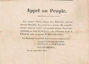 Le , les États généraux acceptent le principe de séparation administrative, mais il est trop tard : les Journées de septembre ont définitivement détourné les Belges de Guillaume Ier. L'opinion majoritaire était qu'un roi qui avait fait couler le sang de son peuple ne pouvait plus régner[82] . Le , le Gouvernement provisoire proclame l'indépendance de la Belgique. Il annonce la rédaction d'un projet de constitution et la convocation prochaine d'un Congrès national[83].