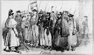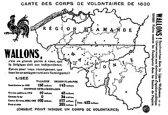 Lorsque les troubles éclatèrent à Bruxelles, les premières couleurs arborées par les émeutiers furent celles du drapeau français, symbole, selon l'historien Robert Demoulin « à la fois de liberté politique, de sympathie française et d'aspirations sociales »[52]. À Verviers, les ouvriers, chantant La Marseillaise, forcent les portes de l'hôtel de ville et placent un drapeau français au faîte de l'édifice au grand dam des notables qui y voient un symbole révolutionnaire[53],[54]. À Liège, des placards sont affichés partout en ville demandant le rattachement de la Belgique à la France et des cocardes seraient prêtes à être distribuées[55]. Comme à Liège, des drapeaux français sont arborés à Namur[56]. Selon Surlet de Chokier, l'état d'esprit est le même dans toute la province de Liège, de Luxembourg, de Namur et du Hainaut[57],[58]. Selon Jacques Logie, « l'adoption des couleurs françaises par les ouvriers et les sans-travail ne reflétait [...] pas des sentiments francophiles, mais représentait une aspiration vers la liberté et un certain progressisme, dont les trois couleurs n'étaient que le symbole[59]. » Édouard Ducpétiaux raconte :