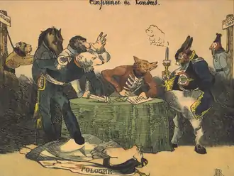 Lorsque Louis de Potter et ses collègues déclarent l'indépendance de la Belgique depuis le balcon de l'hôtel de ville le , Guillaume Ier des Pays-Bas fait appel aux puissances coalisées pour maintenir ses prérogatives sur les territoires rebelles[33]. Les grandes puissances conservatrices (Prusse, Autriche, Russie) sont favorables au maintien, par la force s’il le faut, de la Belgique à l’intérieur du royaume des Pays-Bas. Seule la Russie offre une aide militaire aux Pays-Bas, mais à partir du une insurrection éclate en Pologne et elle ne peut envoyer de troupes à Guillaume Ier. Par ailleurs, le Royaume-Uni craignait que la France annexe la Belgique.