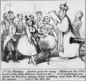 La légende dit : « Troisièmement le mariage. L'Autriche la conduit à l'autel ; Metternich, l'archiprêtre de la Sainte-Alliance la marie ; le sacristain Castlereagh crie « amen » ; le Russe danse à son mariage et John Bull paie les frais. – Fin de l'acte premier. »
