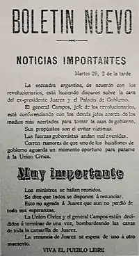 En , le gouvernement entra en cessation de paiement pour sa dette extérieure contractée chez la banque Baring Brothers, objet de grand mécontentement chez les investisseurs étrangers[7]. Ce même mois, le Comité révolutionnaire se composait à présent de Leandro Alem, Aristóbulo del Valle, Mariano Demaría, Juan José Romero, Manuel A. Ocampo, Miguel Goyena, Lucio V. López, José María Cantilo, Hipólito Yrigoyen, des généraux Manuel Jorge Campos et Domingo Viejobueno, des colonels Julio Figueroa et Martín Irigoyen, et du commandant Joaquín Montaña.